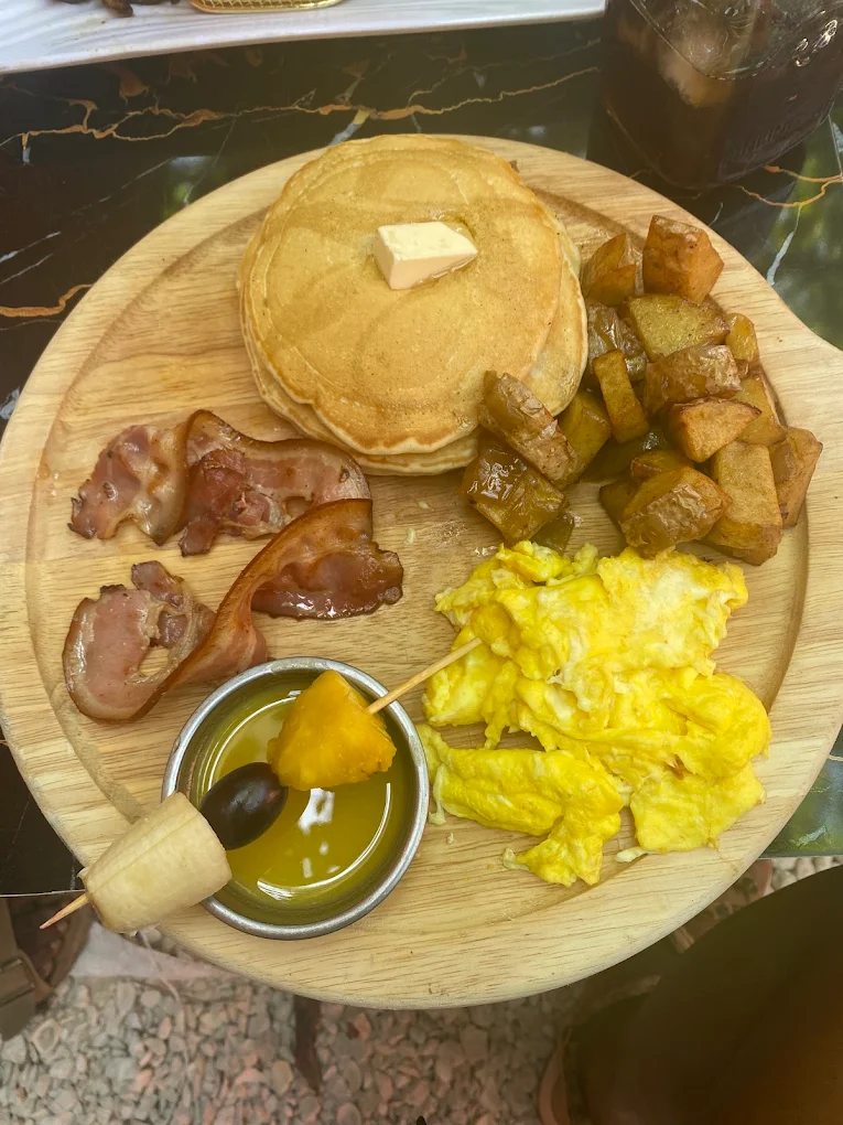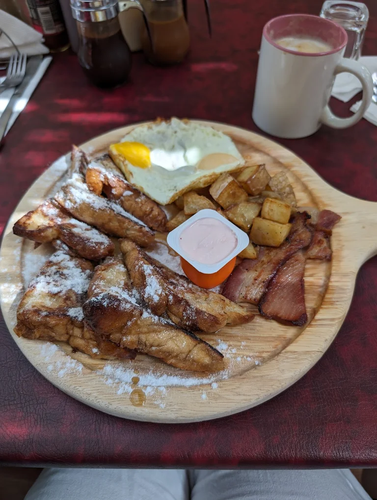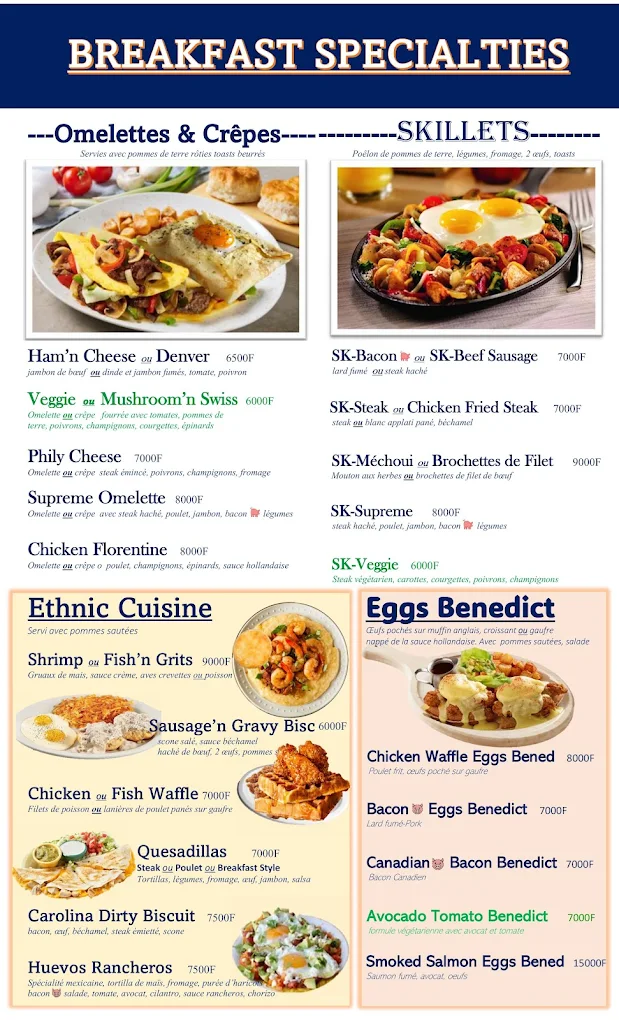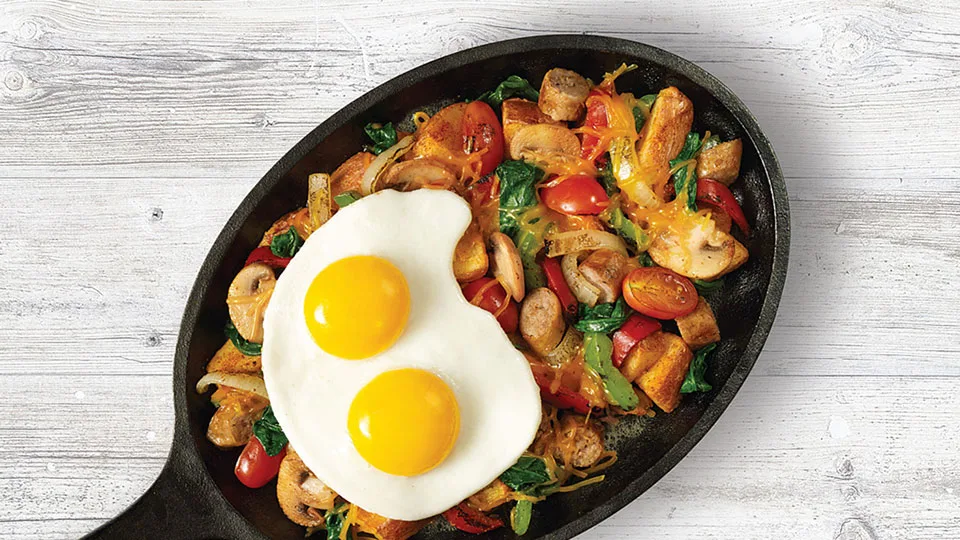 Commencez la journée avec notre Poêlée Rustique du Chef, un plat généreux et plein de caractère. Ce petit-déjeuner gourmand, servi dans une poêle en fonte, est une symphonie de saveurs. Il se compose d'une base de pommes de terre rissolées, de morceaux de saucisse savoureux, de champignons, d'oignons caramélisés et de poivrons croquants.