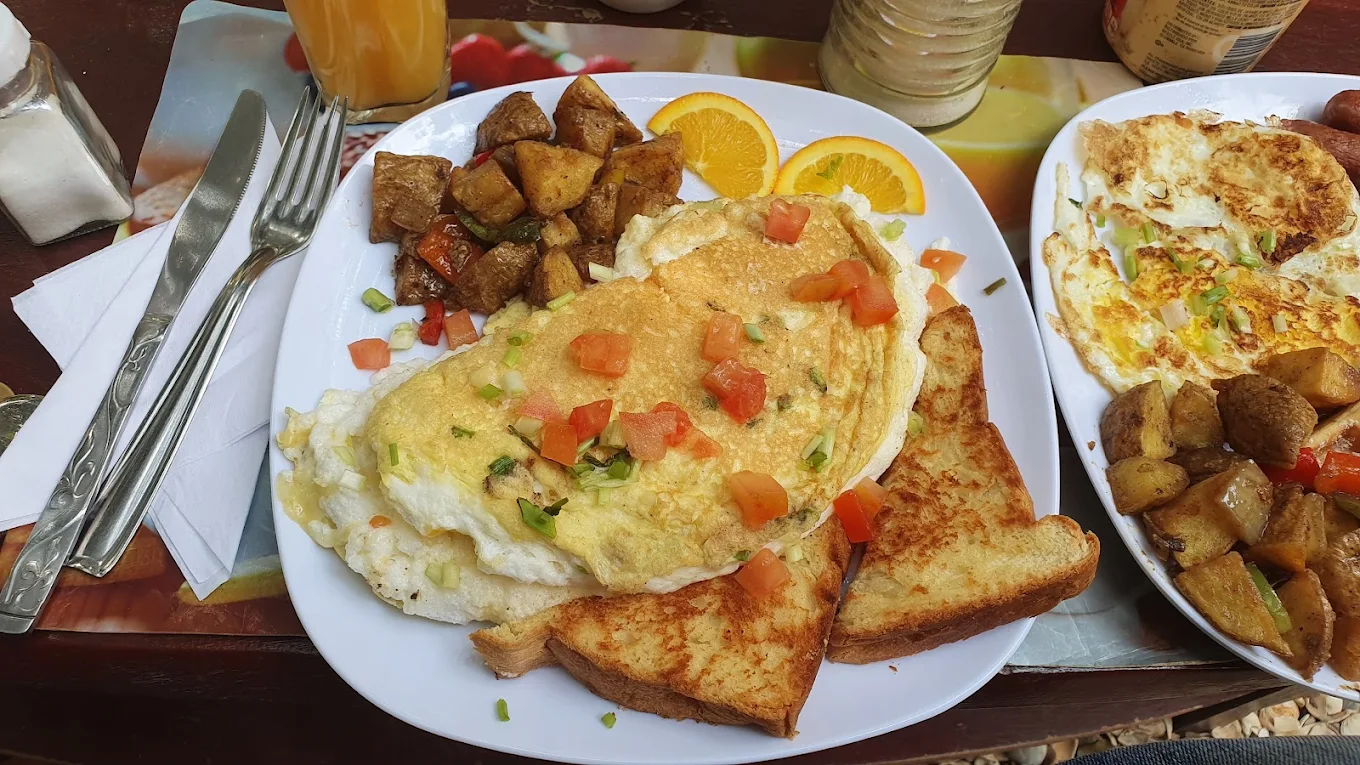 Dégustez notre Omelette du Matin, un classique revisité pour votre plus grand plaisir. Cette omelette généreuse et moelleuse est garnie de tomates fraîches et d'oignons verts. Elle est accompagnée de pommes de terre rissolées, parfaitement dorées, ainsi que de tranches de pain grillé pour un repas complet.